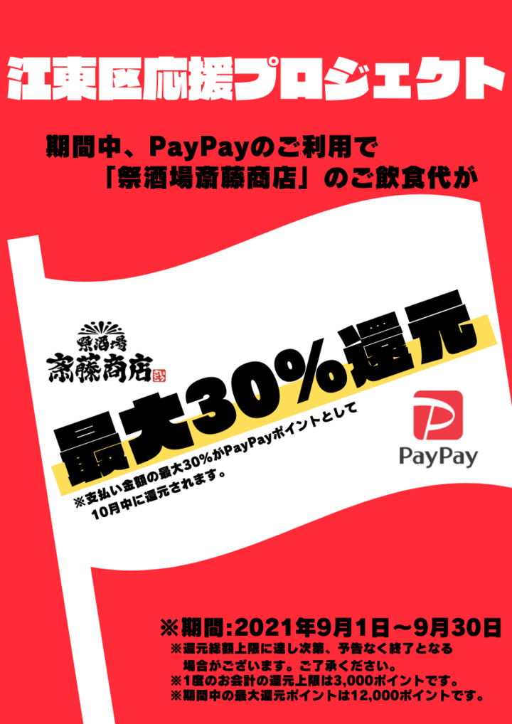 門前仲町「祭酒場 斎藤商店」ではPayPayの江東区応援プロジェクトに伴い、9月いっぱいPayPayでお支払いのご飲食代が最大30%還元となります!
