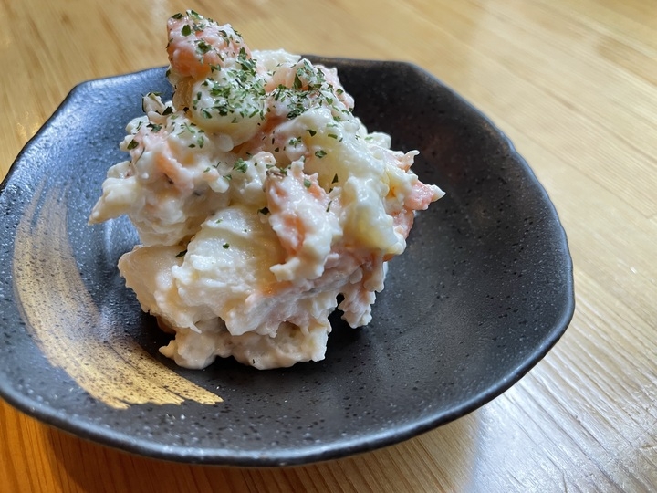 斎藤商店の定番メニュー、ポテトサラダ。今回の新メニューでは秋らしいスモークチーズとスモークサーモンを混ぜた少しオトナな味わいになりました!