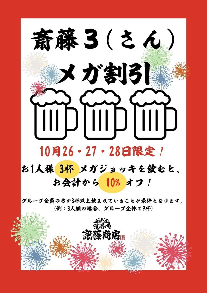 斎藤商店でご好評いただいている、グループ全員が3杯メガハイを飲むとお会計が5%オフになる斎藤3メガ割引が期間限定でさらにお得に!